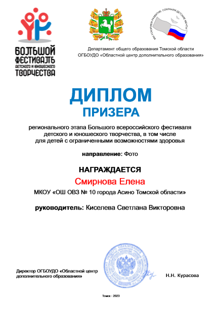 7. Региональный этап Большого всероссийского фестиваля детского и юношеского творчества, в том числе для детей с ограниченными возможностями здоровья, направление фото (диплом призера)